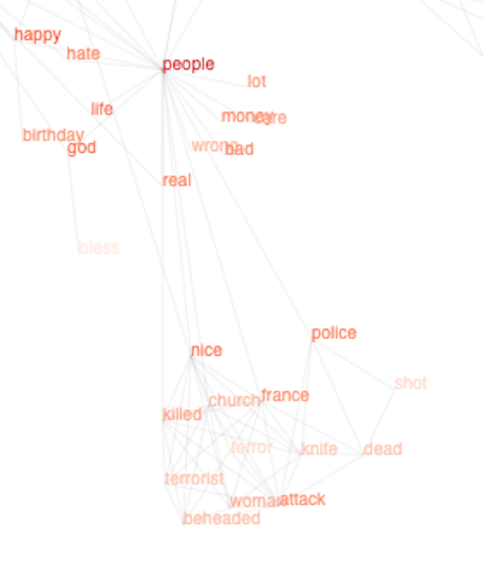 The recent events in Nice, France appeared in the analysis. Initially ‘nice’ and ‘attack’ became apparent on the graph, swiftly followed by more details of what was happening on the ground as people began to tweet.
